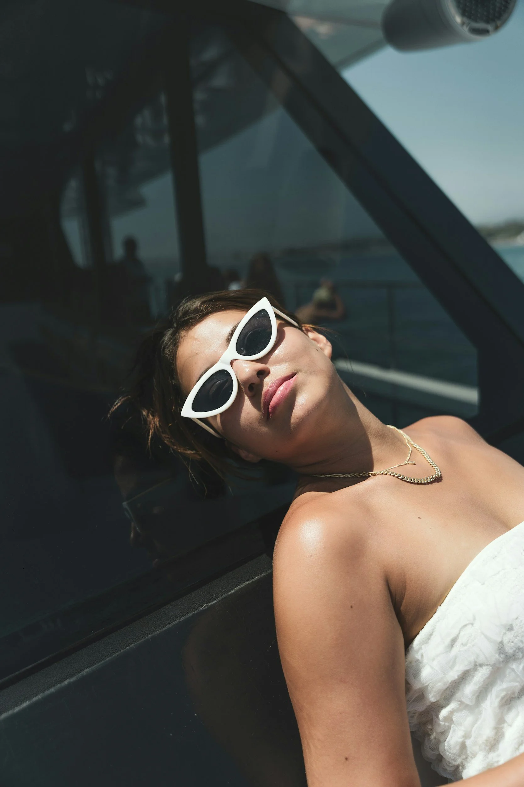 A woman wearing a red suit and heart-shaped sunglasses, standing against a plain background with a shadow cast on the wall.
